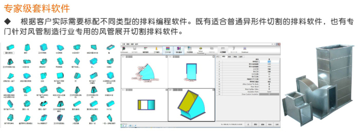 3.對(duì)于鈑金或風(fēng)管展開(kāi)切割用戶(hù):本設(shè)備可與金林鈑金、CAM-DUCT、Lantek等風(fēng)管行業(yè)專(zhuān)用軟件實(shí)現(xiàn)無(wú)縫對(duì)接,用戶(hù)只需在軟件中選擇鈑金件樣式、輸入簡(jiǎn)單的參數(shù),即可自動(dòng)生成展開(kāi)件、自動(dòng)排料、自動(dòng)生成切割程序,然后調(diào)入到數(shù)控切割機(jī)中進(jìn)行切割加工,使鈑金切割工作更便捷、更高效。